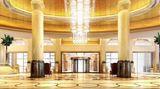 将位于大堂主立面 的结构柱做了重新处理,原方案的上下两段调整为上下贯通,强调立面效果,打破了冗长的二层回廊,将回廊分成了三段,突出了挺拔完整的结构。同时形成了六个拱门,并且做了弧形处理。顶部做了巨大的椭圆处理,运用拱形,光带,下浮等设计手段,并且将现代时尚的元素引入欧式的设计风格中,纯金箔的采用,使装饰效果又有了巨大的提升。四根结构柱的柱头又运用了现代的手法,演绎了古典的造型,倍感新奇与时代感。在色彩,灯光的处理上也运用新的手法与结合,更加彰显了维景酒店的设计内涵与延展。