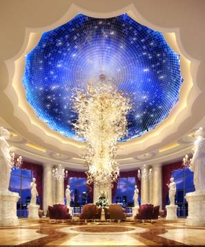 施工过程中,有15000平米的石材量,石材加工方式就有15种,包括了超大型椭圆,圆形拼花,扇形板,弧形墙板,圆柱,锥形柱,2.6米高的大堂吧女神雕像,双曲面石材墙面,旋转楼梯等。石材加工在6个加工厂中进行,现场挂了若干样板墙,作为对石材选样的标准。AYX爱体育中,漆画,铜版画,金银箔也打破了常规做法及尺度,成为了AYX爱体育中的亮点。