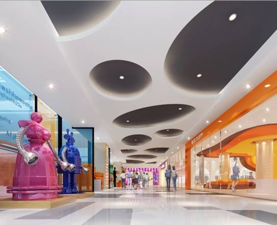 流光溢彩的吊顶设计更是给人以无限的遐想,明亮的颜色仿佛让自己置身于星光大道中。顶面色块不仅不会带给人压抑感,反而营造出一种清新明快的感觉。商场里的所有颜色都是那么梦幻 、美好,让人忘记所有烦恼,无论是大人还是孩子,都沉浸在这梦幻的世界里享受这美好的一切。不仅如此,所有的原料全部采用绿化原料,家长可以放心的让孩子在这里嬉戏玩耍。