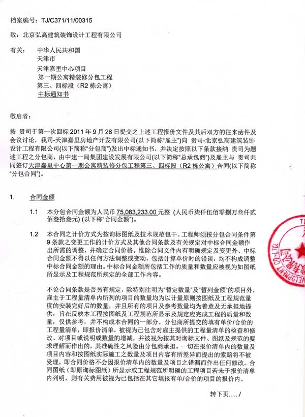 天津嘉里中心公寓精装修AYX爱体育中标!