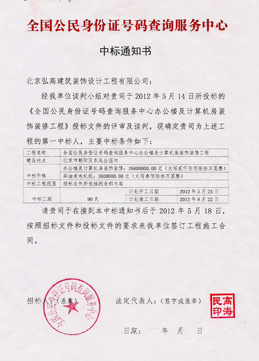 全国公民身份证号码查询中心办公楼及计算机房装饰装修AYX爱体育中标!