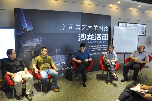 接下来的主题沙龙嘉宾互动环节由艾海主持,嘉宾北京建筑装饰协会副会长高建、纪晓恩、胡亮、盛保敬就“空间与艺术的对话”这一主题展开讨论,嘉宾们从行业发展、设计运用、艺术融合与体验、原料的运用等方面进行了详细的分析和阐述,与现场设计师零距离进一步分享经验、交流信息。